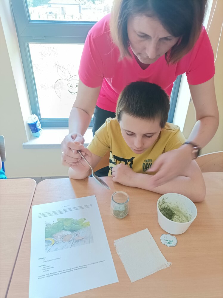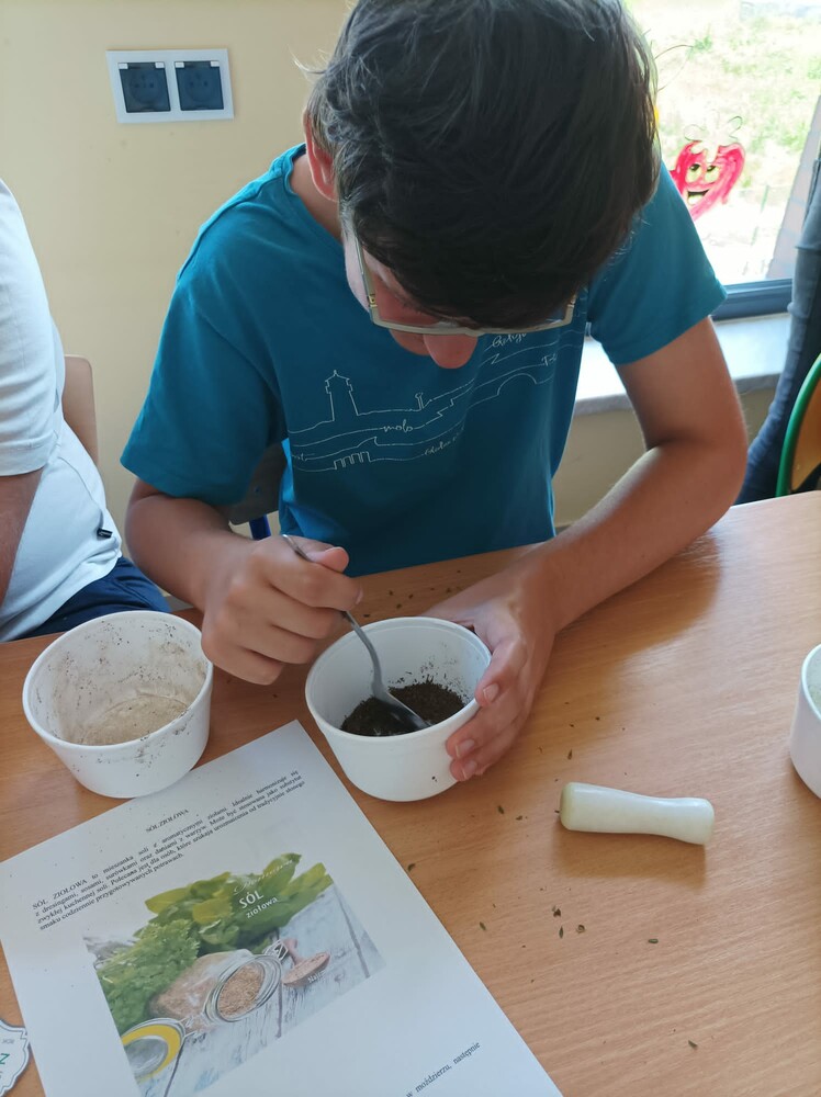 „Zaczarowany Ogród” nadal tętni życiem. Grupa edukacyjno – terapeutyczna brała udział w zajęciach z hortiterapii. Uczniowie zapoznali się z nazwami, wyglądem, budową, właściwościami i zastosowaniem ziół. Podczas spaceru po ogrodzie wielozmysłowo czerpali korzyści wynikające z przebywania w nim oraz podejmowali działania na rzecz pielęgnacji ogrodu, m.in. podlewali i ścinali zioła, które zostały wykorzystane na zajęciach praktycznych. W pracowni kulinarnej uczniowie wykonali lemoniadę i sól ziołową. Zwieńczeniem zajęć była degustacja lemoniady, a wykonana sól zostanie zużyta w domowej kuchni. Uczestnicy zajęć zapewnili nas, że będą odwiedzać ogród i korzystać z rosnących w nim ziół.