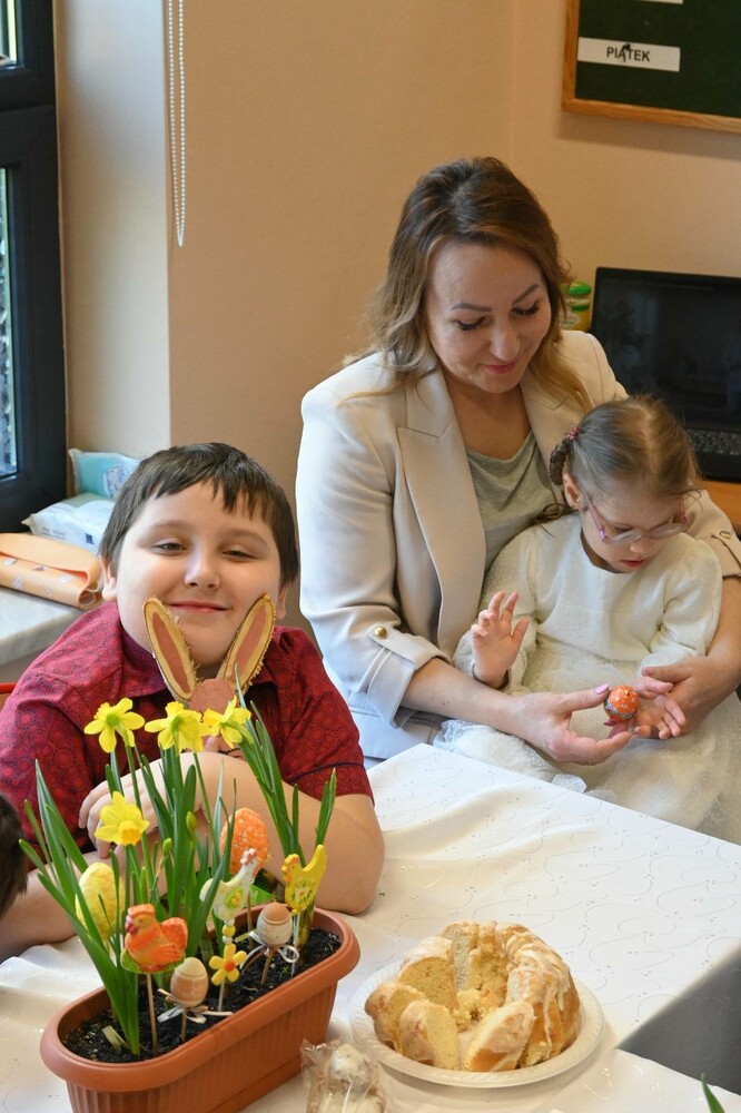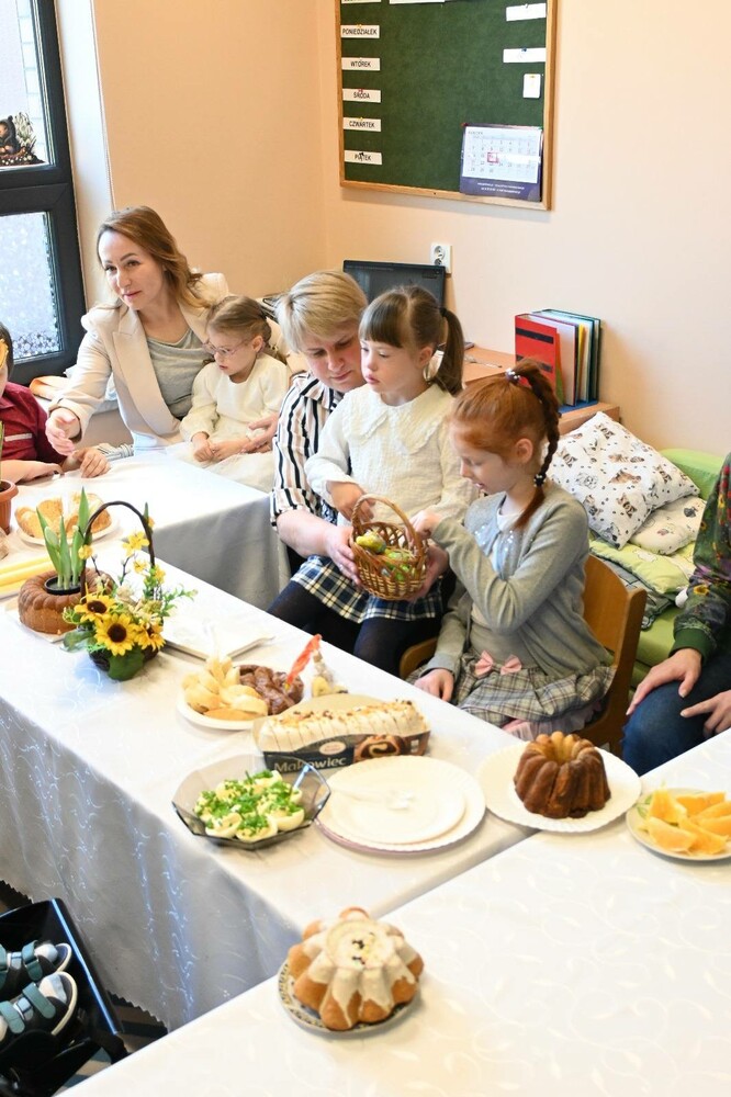 Przez ostatnie dni dzieci poznawały różne tradycje związane ze świętami Wielkiej Nocy, wspólnie dekorowały sale, siały owies, malowały pisanki. Wszystkie te wspólnie wytworzone akcenty wielkanocne znalazły się na stole. Zwieńczeniem licznych opowieści o zwyczajach Wielkanocnych było wspólne świąteczne śniadanie. Nie mogło zabraknąć jajka, baranka, kiełbaski, babki, makowca. Ten dzień miał wyjątkowy charakter, dzieci słuchały piosenek związanych z tradycjami wielkanocnymi. Spotkanie przy wspólnym świątecznym stole sprawiło dzieciom wiele radości.